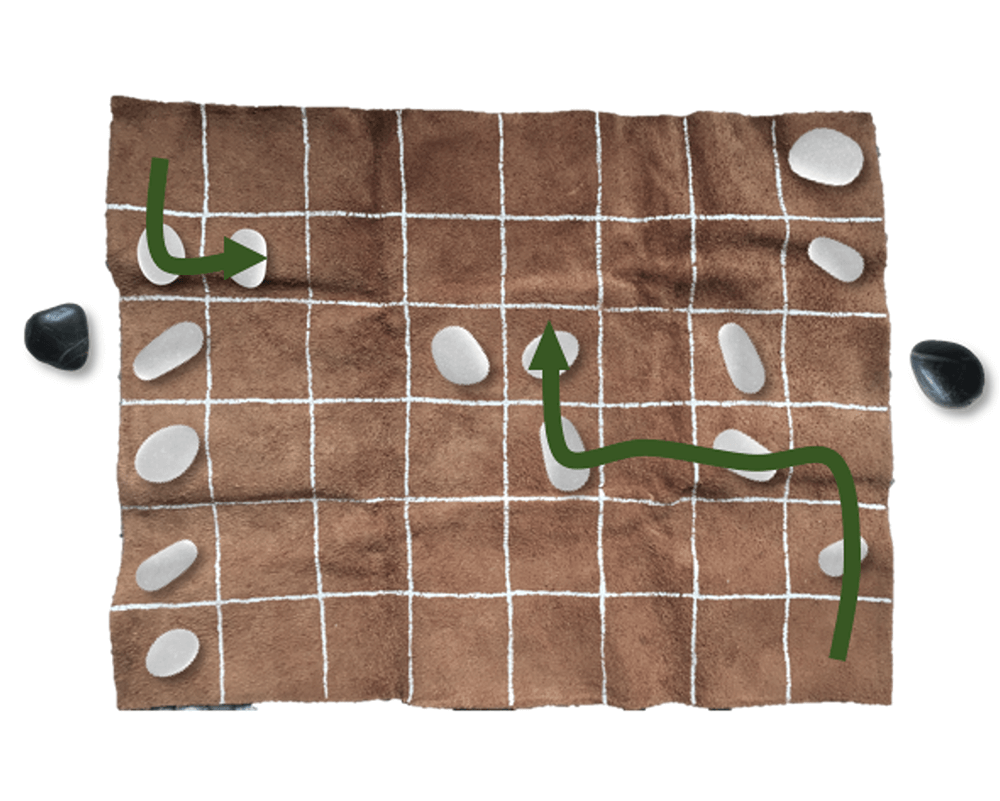 Svart sten får flyttas framåt, bakåt och i sidled hur långt som helst, men måste alltid hoppa på ljusa stenar och ska alltid landa på en ljus sten. Svart sten får alltså inte hoppa diagonalt eller på tomma rutor, och den får inte heller landa på en tom ruta.